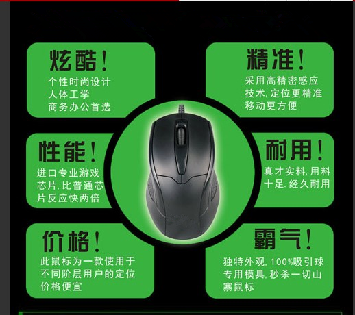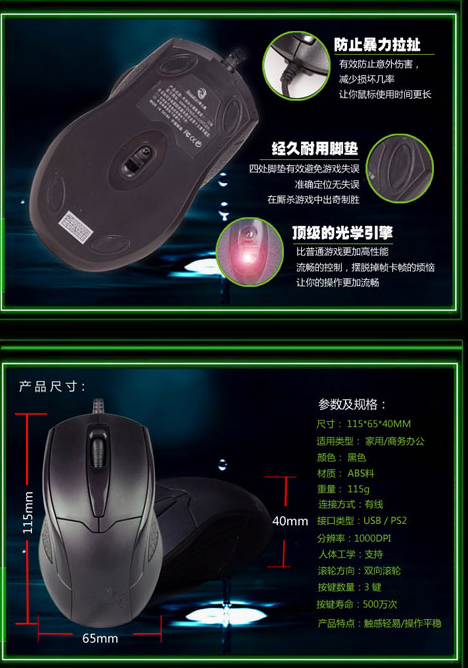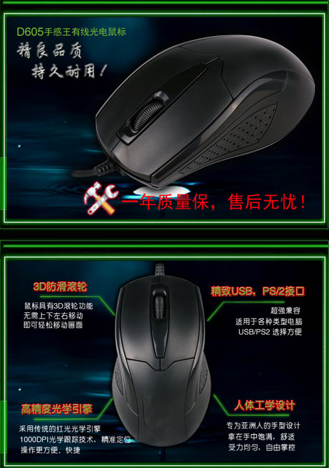 3D防滑轮、精致USB,PS/2接口、高精度光学引擎、人体工学设计